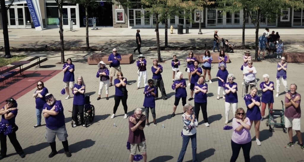 Residents from three Traditions Management senior living communities, Traditions of West Chester, Traditions of Deerfield and Traditions of Lebanon, teamed up on August 24 for a spectacular purple flash mob at Liberty Center to raise awareness and donations for the Alzheimer’s Association! Approximately 50 residents wearing purple for the Alzheimer’s Association gathered at the green space in the Liberty Center shopping center. After quickly learning their steps from a dance instructor on-site, they danced to the “Dirty Dancing” theme song, “The Time of My Life,” by Bill Medley and Jennifer Warnes.